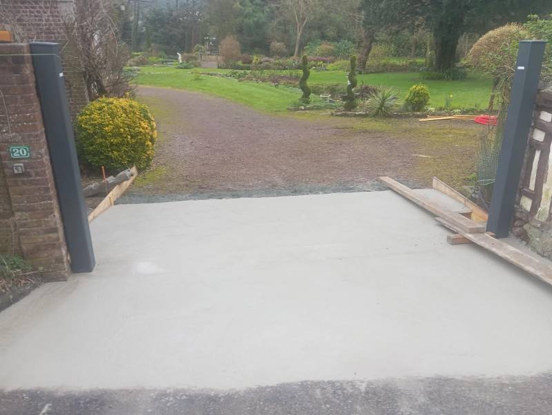 Dans un premier temps, nous avons réalisé un décapage par terrassement après découpe de l'enrobé, chargement et évacuation des gravats. Ensuite, après scellement des poteaux de 1.80m, a eu lieu le terrassement , coffrage, ferraillage et coulage d'une longrine en béton armé de 4m x 0.30m x 0.40m. Enfin, afin de stabiliser l'accès de l'entrée, une dalle en béton armé a été coulée de par et d'autre de la longrine en respectant les pentes pour l'évacuation de l'eau.