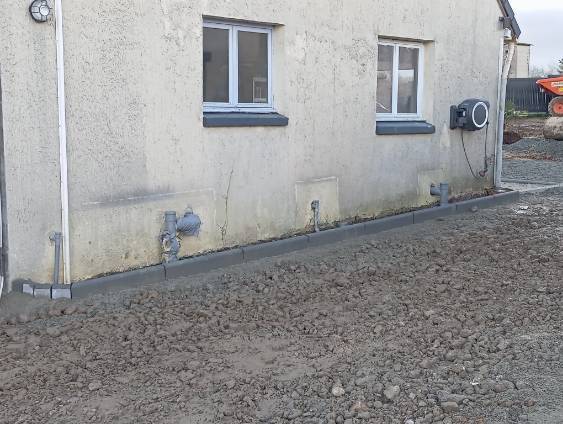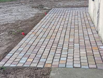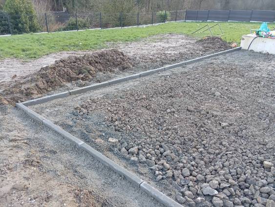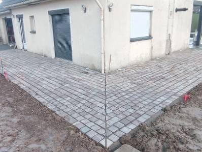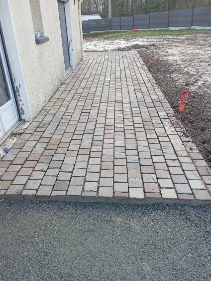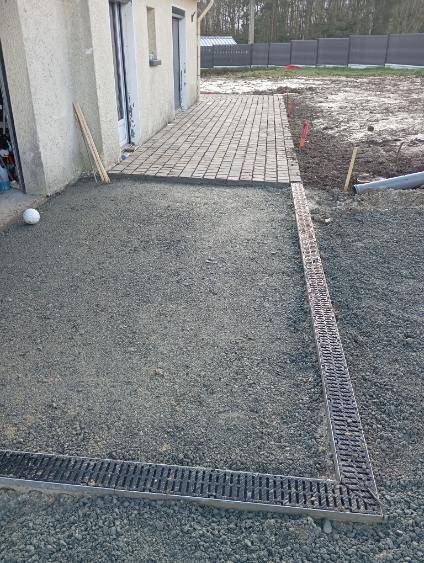 Nos équipes ont réalisés, pour un client à proximité de Valmont, l'aménagement extérieur d'une maison individuelle. Création d'une terrasse en pavés grès d'Inde Kandla sur le pourtour de la maison avec de belles finitions en angles ainsi que l'aménagement de la ventilation pour le vide sanitaire. Puis, dans la perspective de l'application d'enrobé : pose d'aquodrains et de bordures, terrassement des pentes, apport de grave naturelle et compactage.