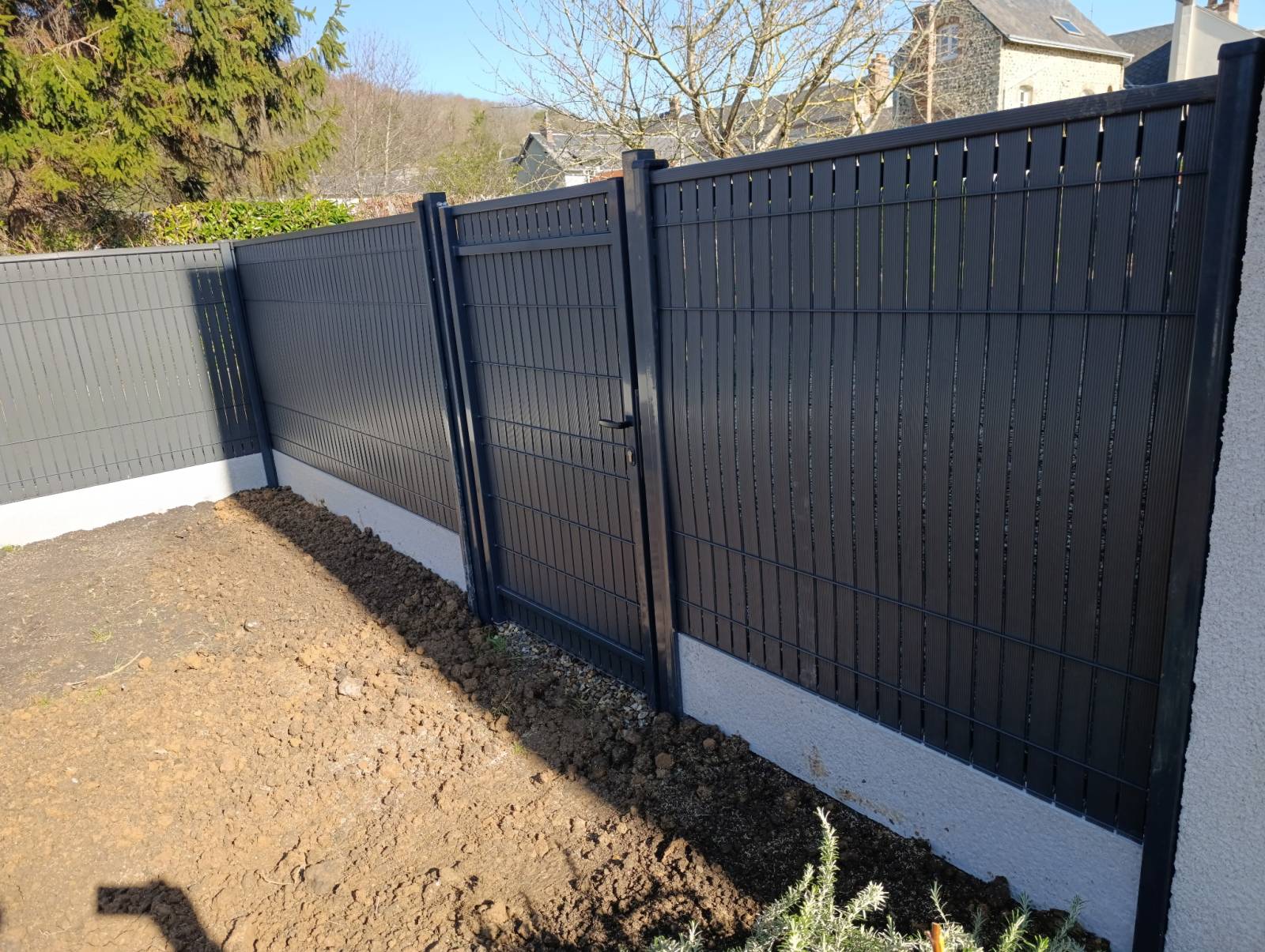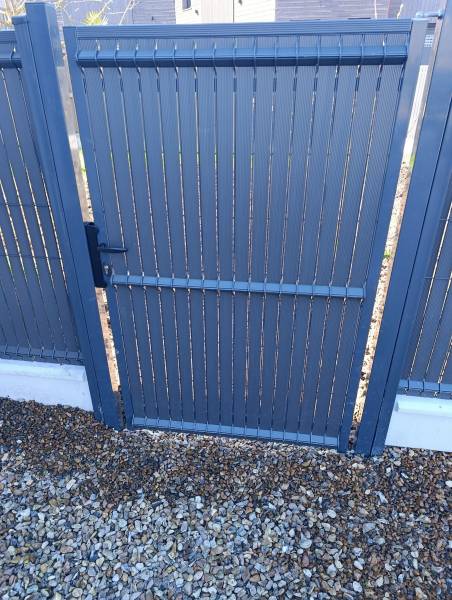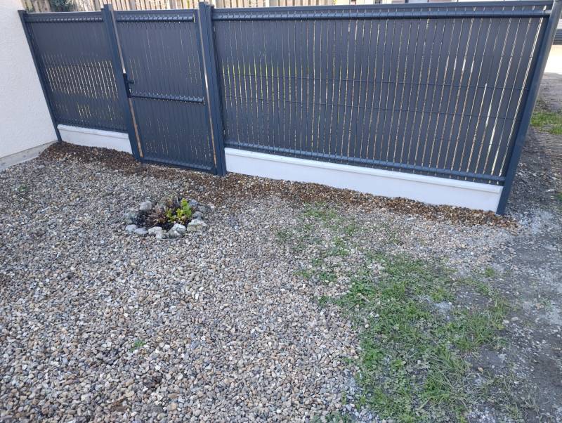 Implantation précise des poteaux, scellement béton, pose de plaques de soubassement et tension optimale du grillage rigide assurent une tenue irréprochable. Intégration de brise-vue PVC gris anthracite pour renforcer l’occultation et préserver votre tranquillité à Fécamp. Installation d’un portillon acier avec système de fermeture sécurisé pour un accès fonctionnel.