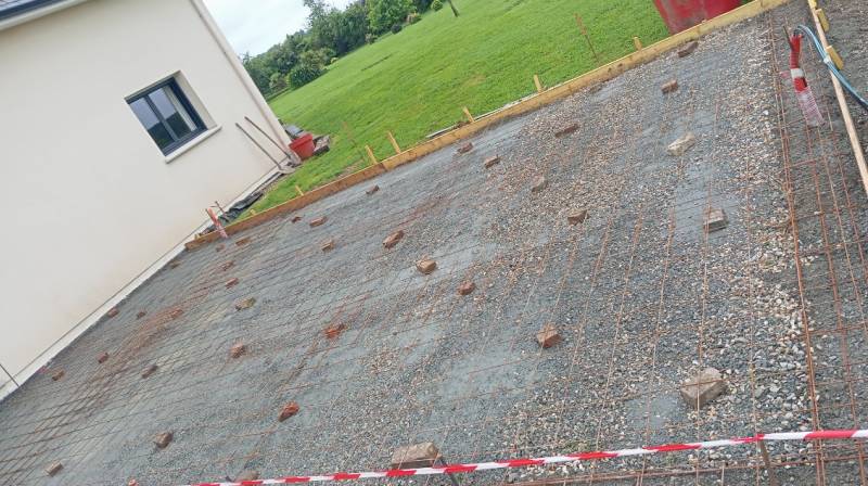 Nous avons réalisé le coffrage, ferraillage et coulage de 15cm de béton C25/30xF1, finition lissée avec sciage des joints de retrait puis décoffrage.